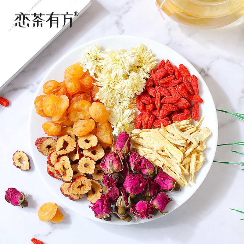 - 原料與配料:桂圓、紅棗、枸杞、玫瑰花茶、薑絲、菊花