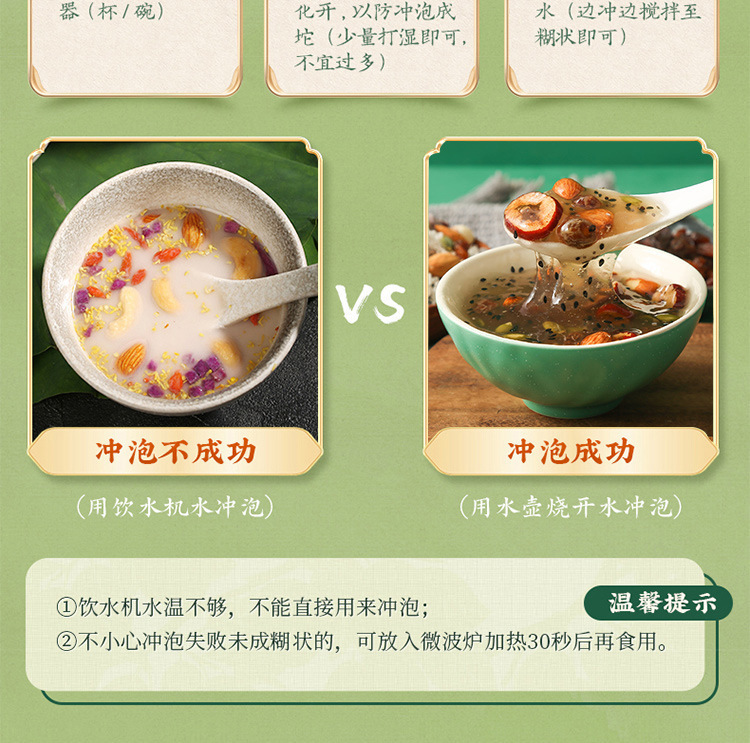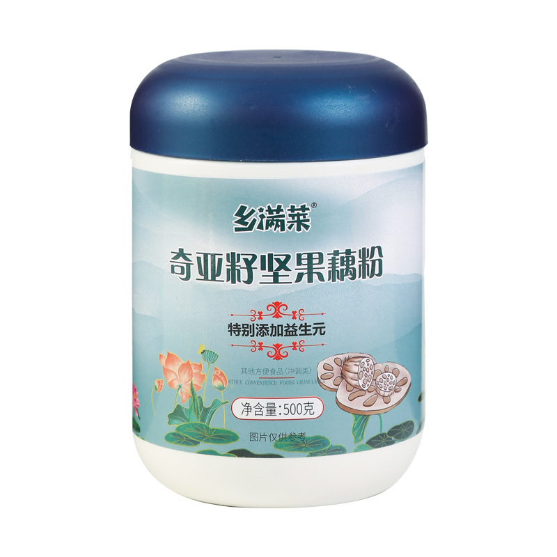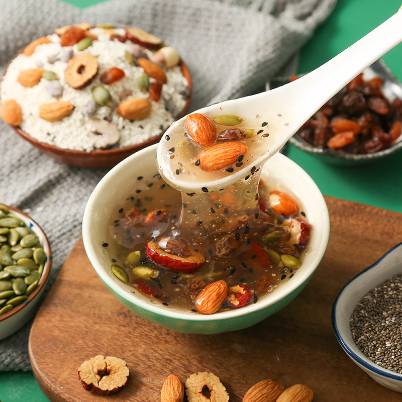 - Raw materials and ingredients: granular lotus root powder, dried red grapes, red date rings, pumpkin seeds, almonds, chia seeds, prebiotics, black sesame seeds, etc.