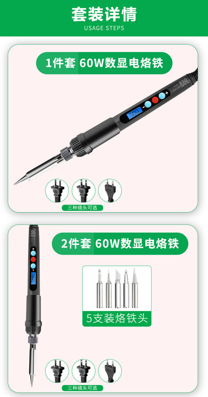 - Model: (Digital display model 2-piece set) European standard electric soldering iron (60W/220V): electric soldering iron + 5 soldering iron tips