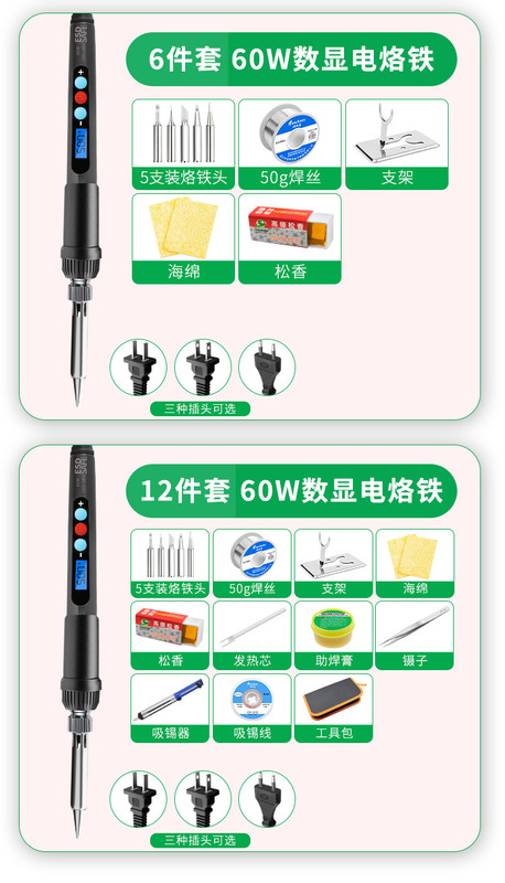 - Model: Digital display 6-piece set of European standard electric soldering iron 60W/220V: electric soldering iron + 5 soldering iron tips + 50 soldering wires + bracket + sponge + rosin