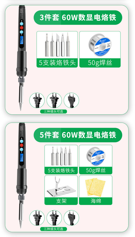 - Model: (digital display 3-piece set) European soldering iron (60W/220V): soldering iron + 5 soldering iron tips + 50 soldering wires