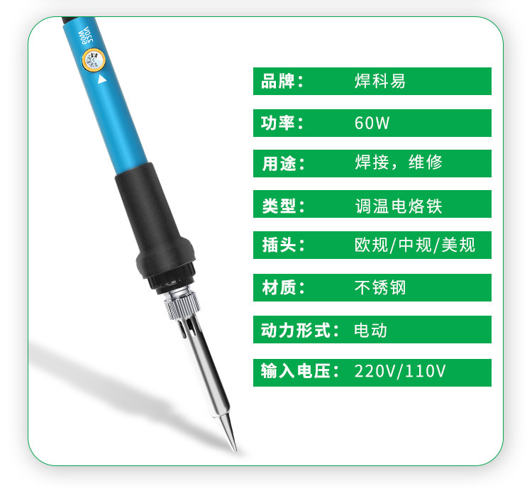 - Model: (temperature-adjustable 2-piece set) European soldering iron (60W/220V): soldering iron + 5 soldering iron tips