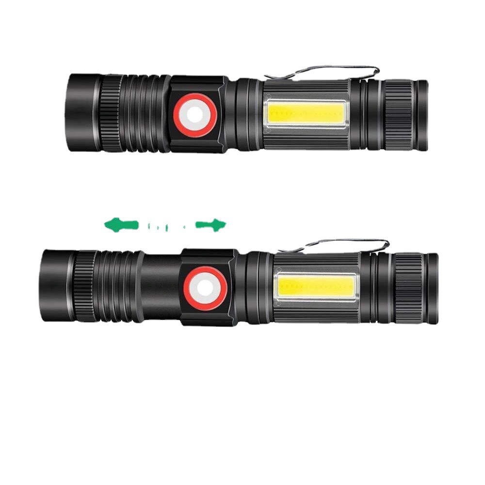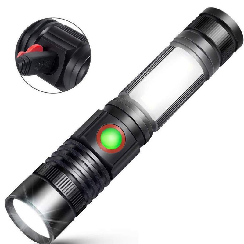 Portable flashlight with 3 lighting modes: High, low, COB side light.