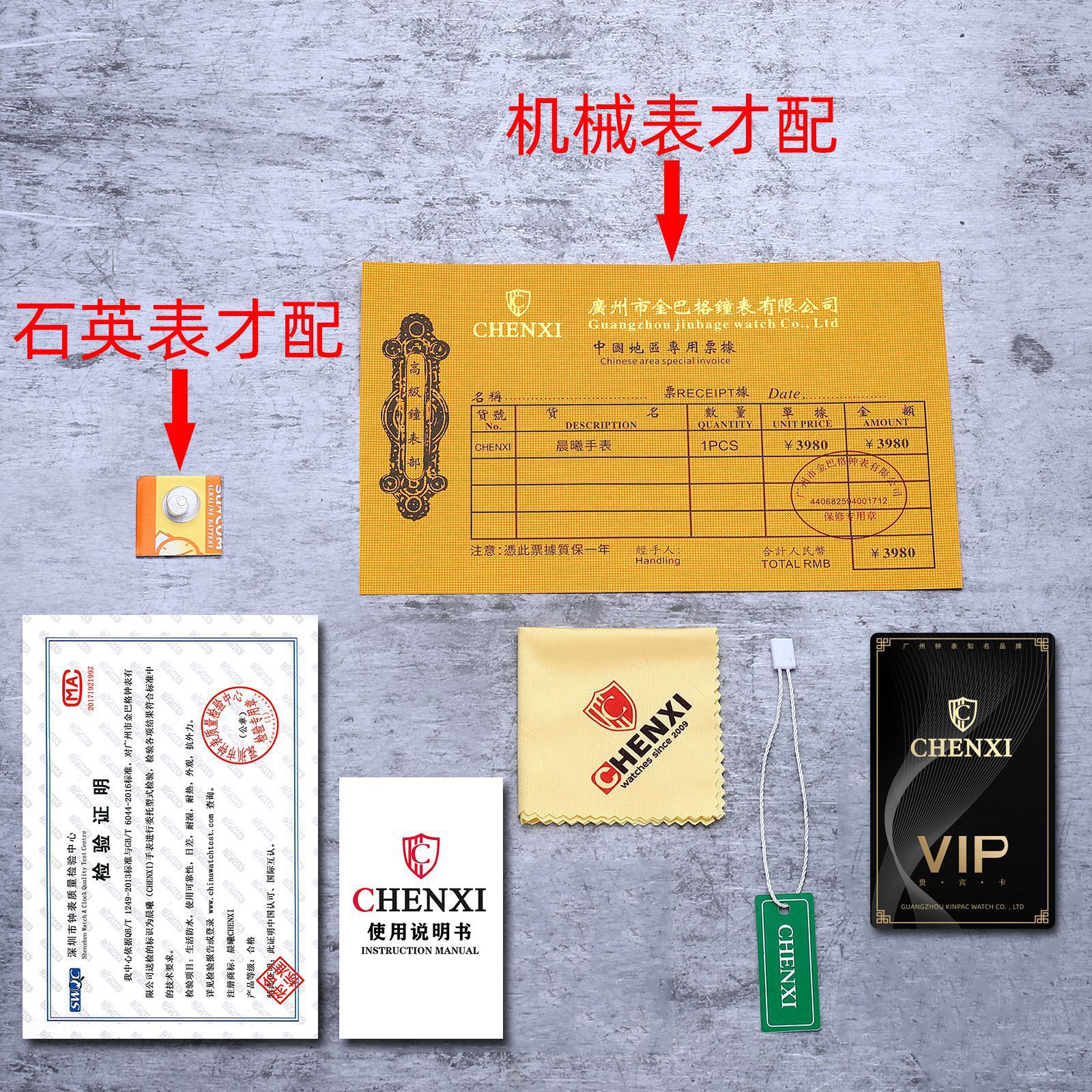 - Specifications: Battery (only for quartz watches) + watch cloth + test certificate + yellow invoice (only for mechanical watches) + instruction manual + VIP card + hangtag