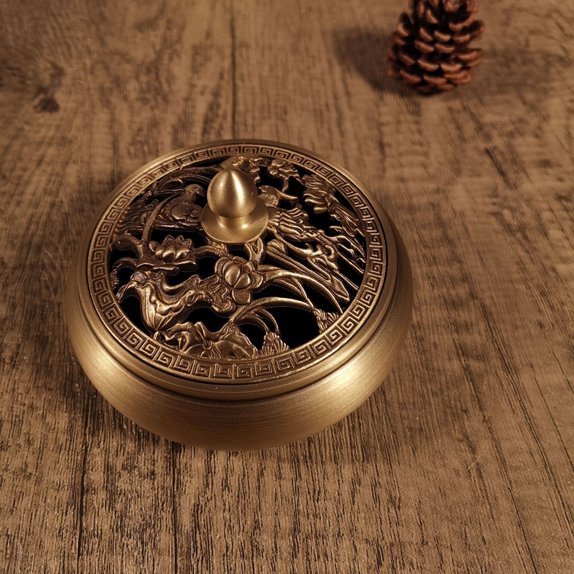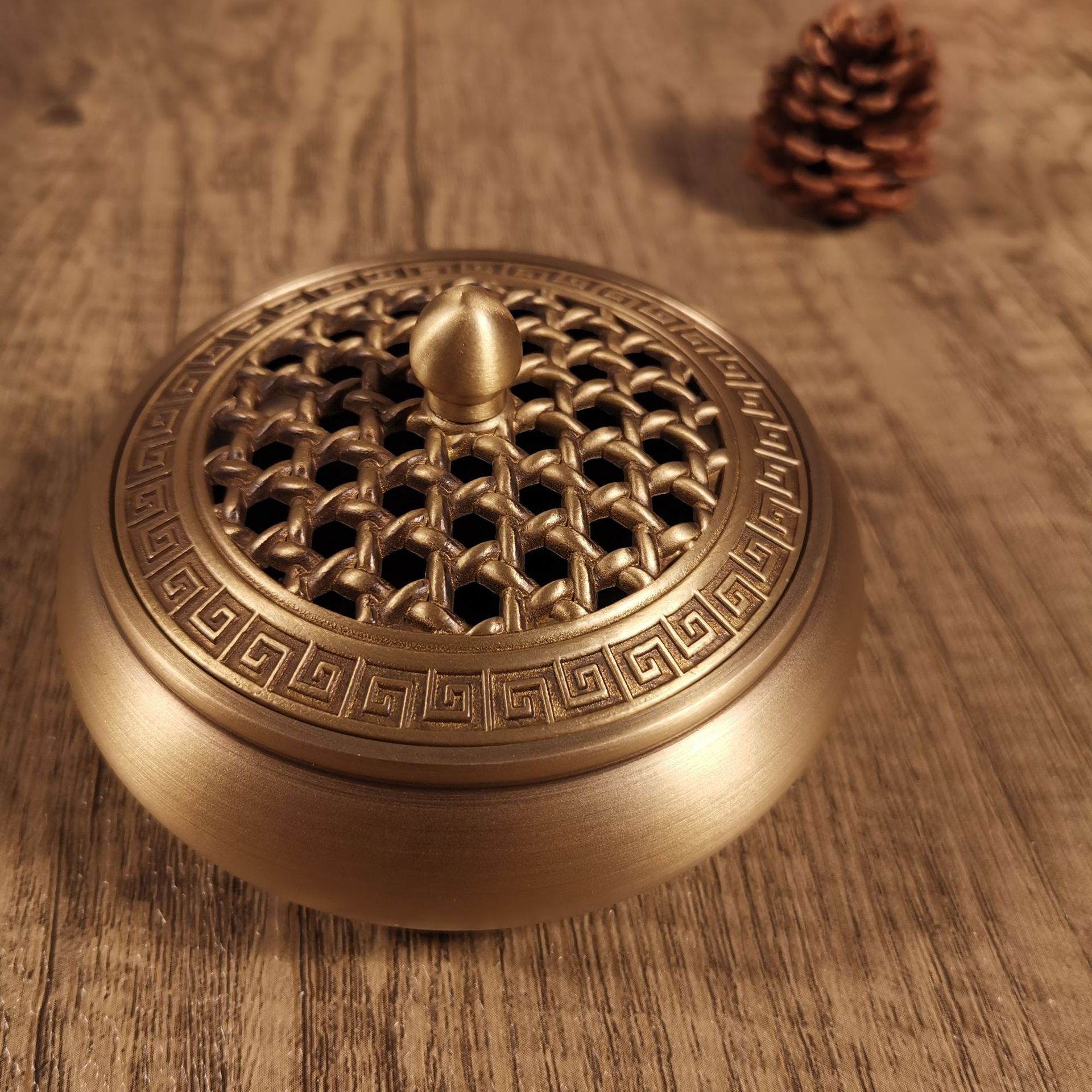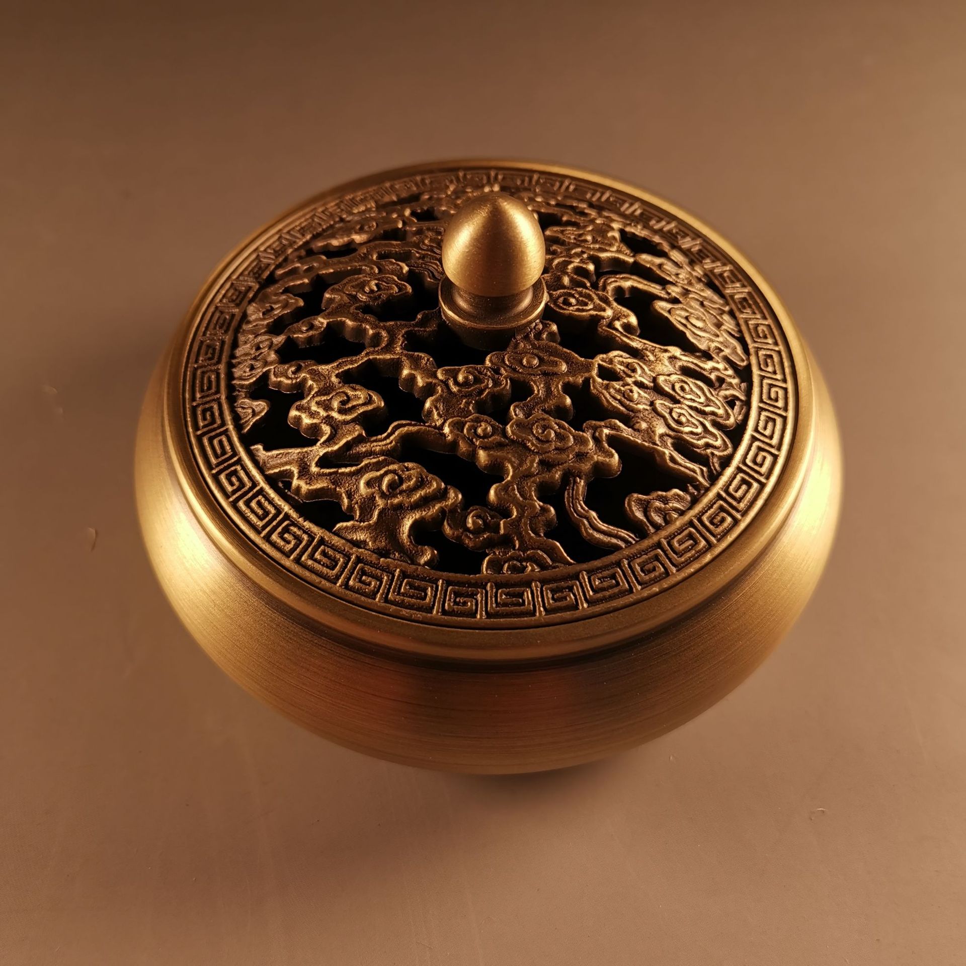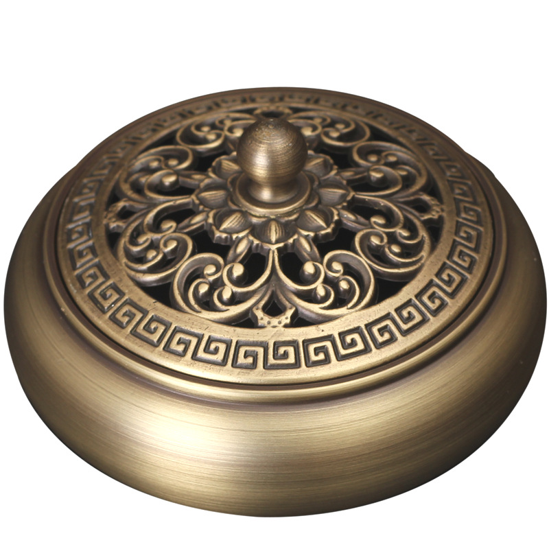 Flat bottom copper incense burner, outer diameter 9.2CM, height 5.6CM, furnace mouth 7cm, comes with copper gourd fireproof cotton, weight 270g, there is a deviation of about 10g.