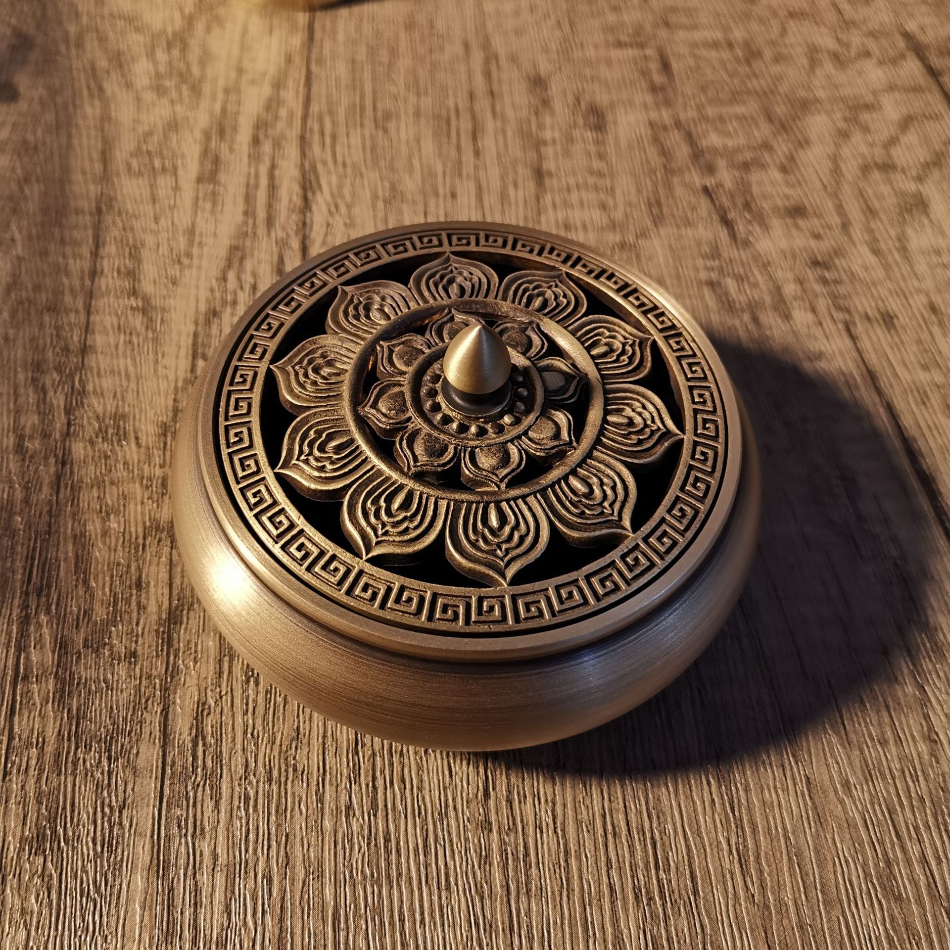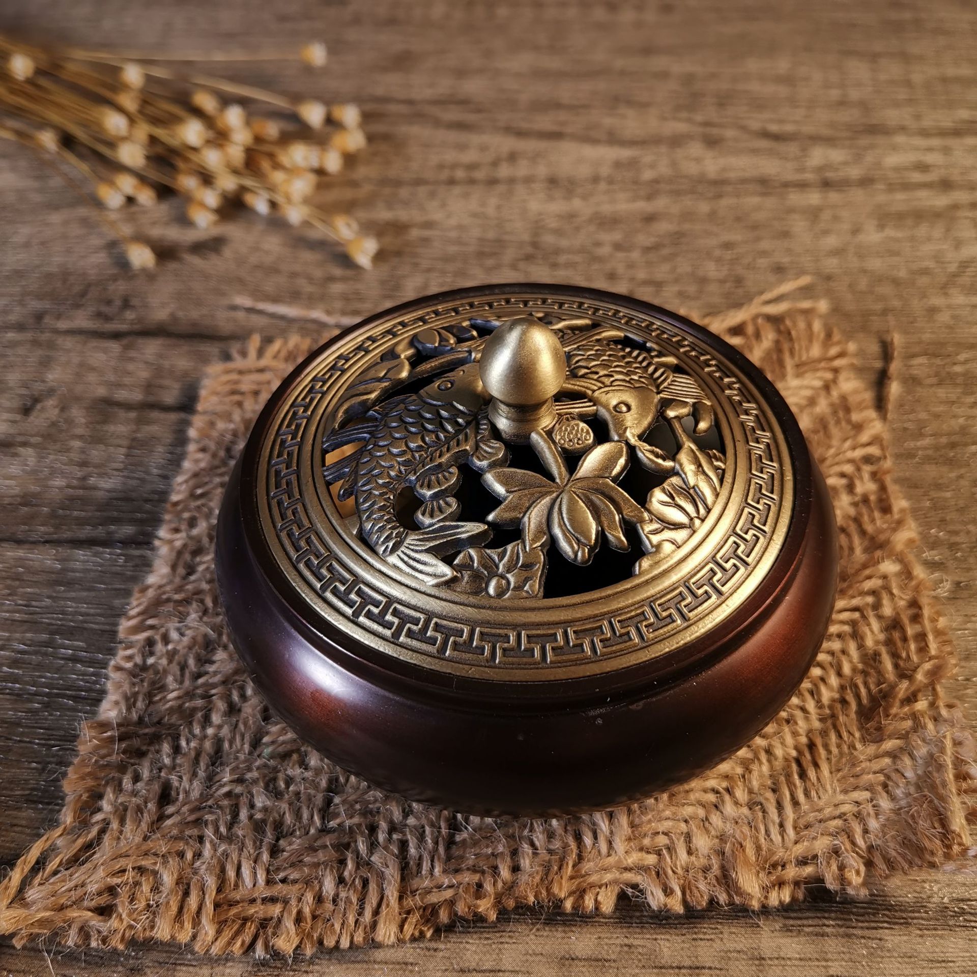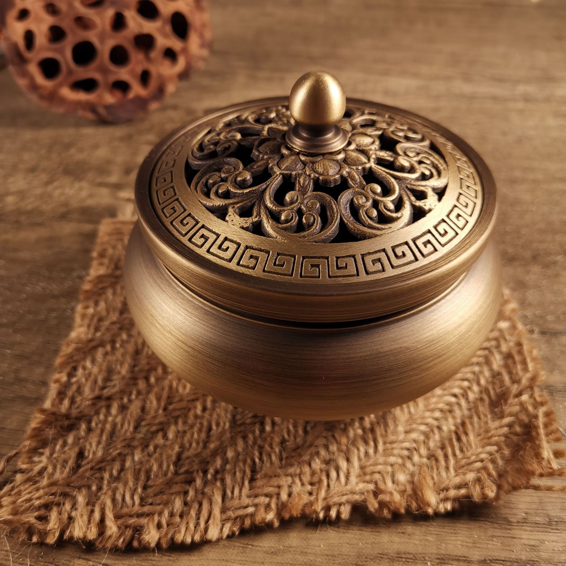 Flat bottom copper incense burner, outer diameter 9.2CM, height 5.6CM, furnace mouth 7cm, comes with copper gourd fireproof cotton, weight 270g, there is a deviation of about 10g.
