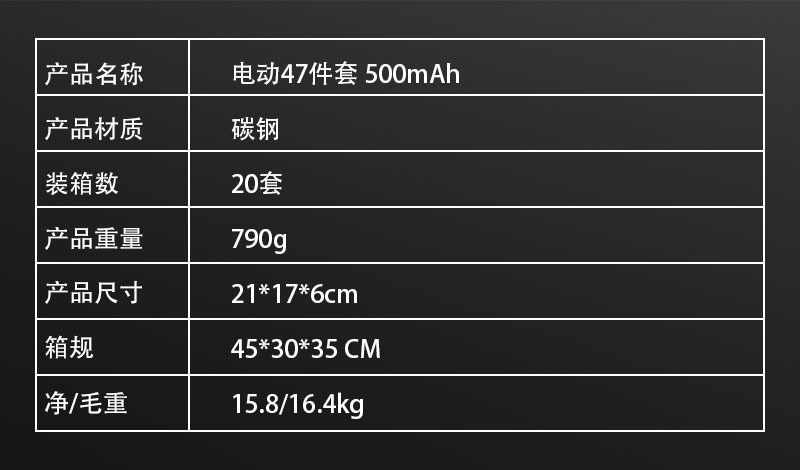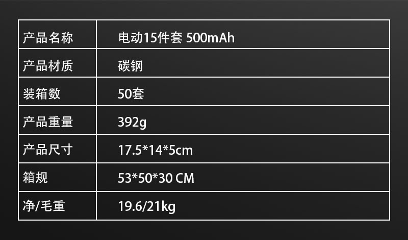 - Specifications and models: Electric 15-piece set