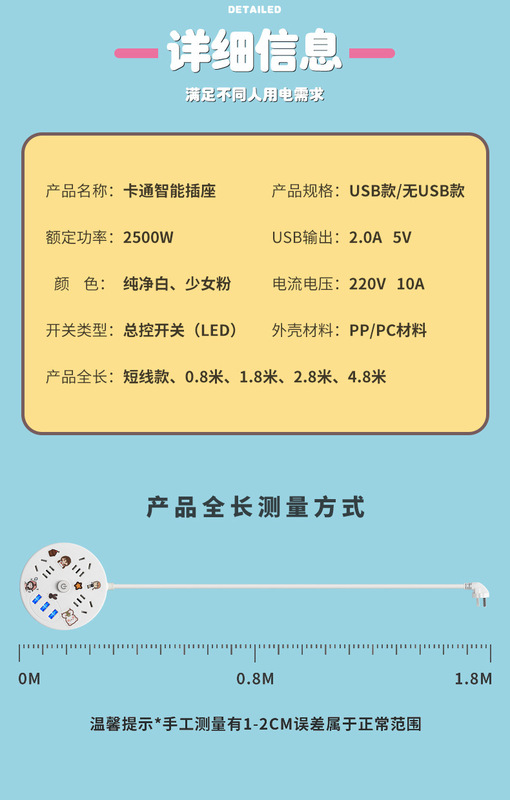 - Specifications and models: [Color shipped randomly] 2 sockets + U4.8 meters