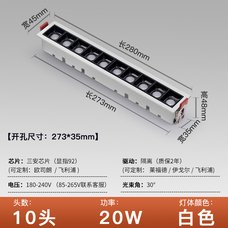 - Power: Open hole 273*35 white shell 10 heads 20W