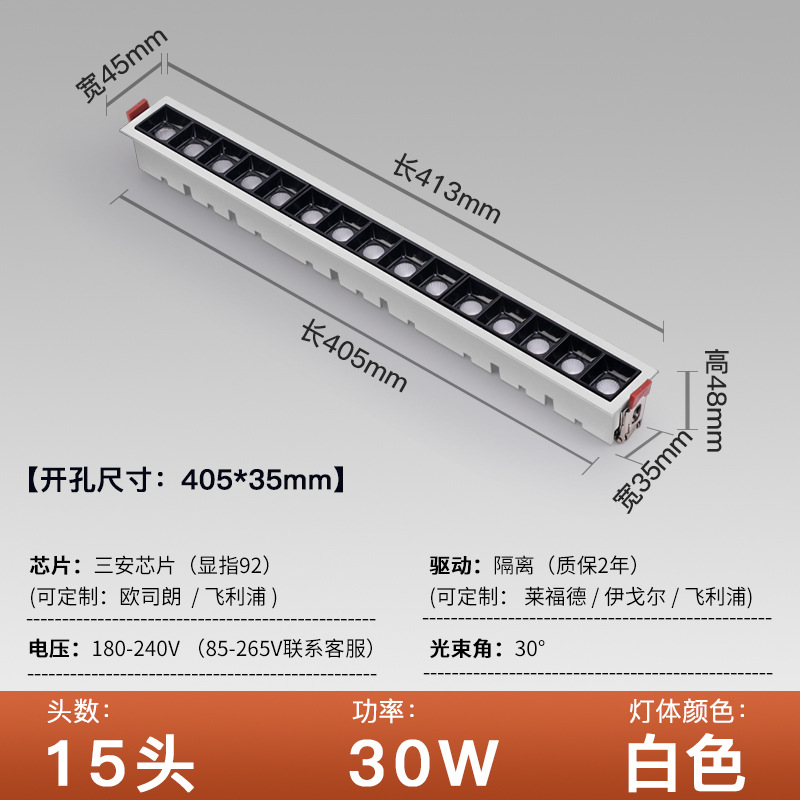 - Power: Open hole 405*35 white shell 15 heads 30W