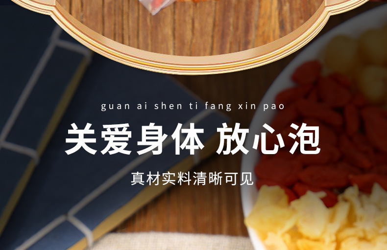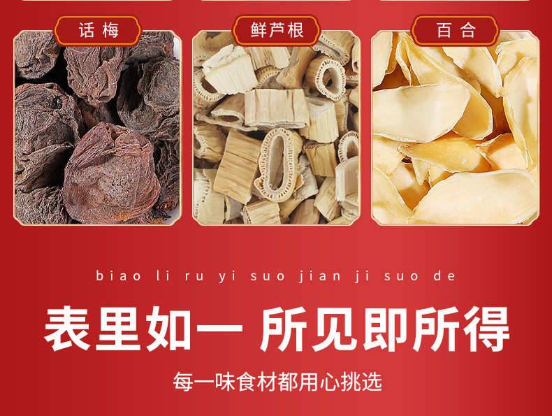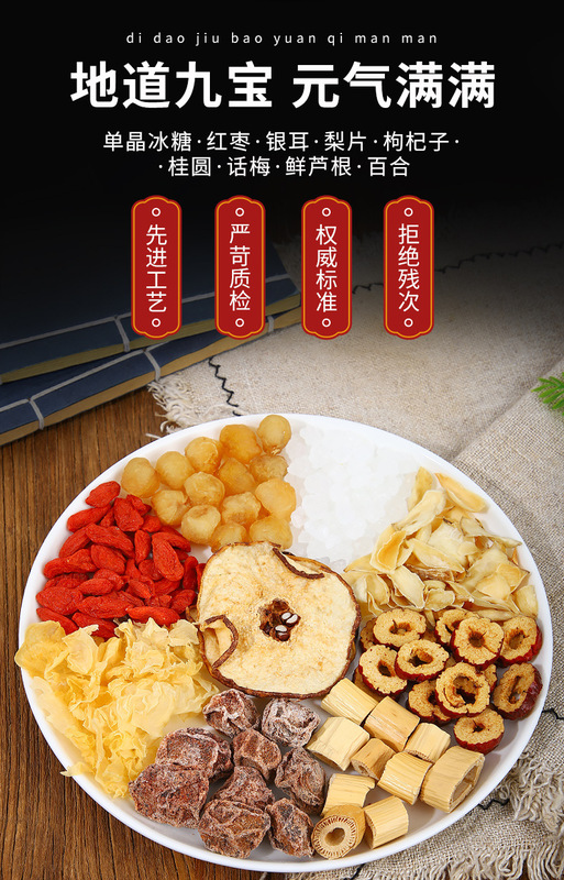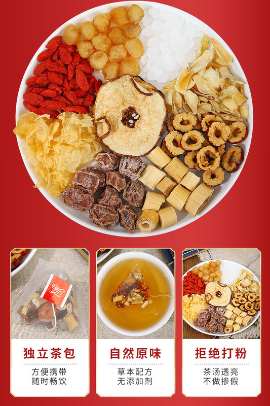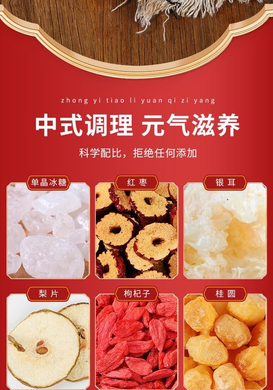 - Raw materials and ingredients: rock sugar, longan, wolfberry, white fungus, black plum, fresh grass root, jujube, lily