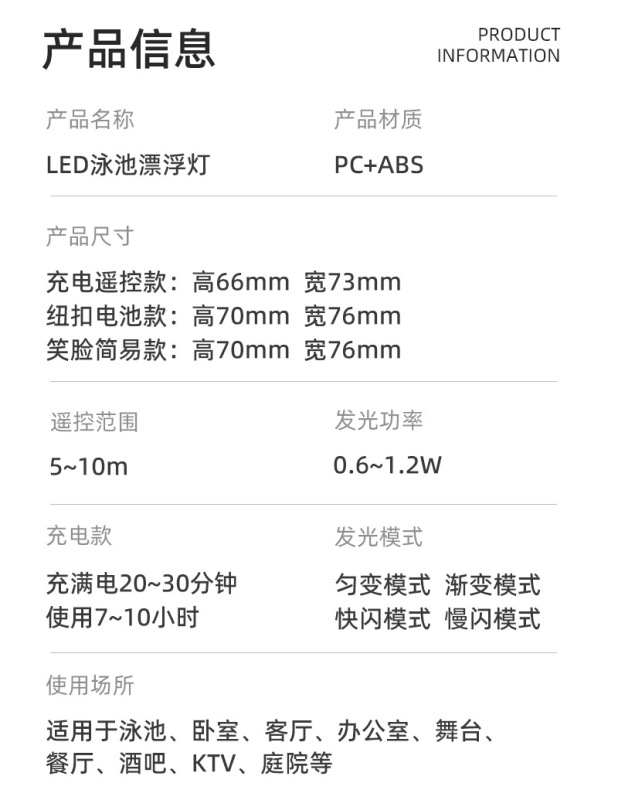 - Power: 7.5cm USB Charging Model (IP68 Waterproof)