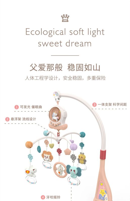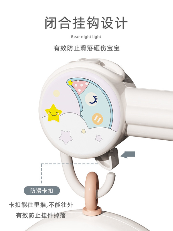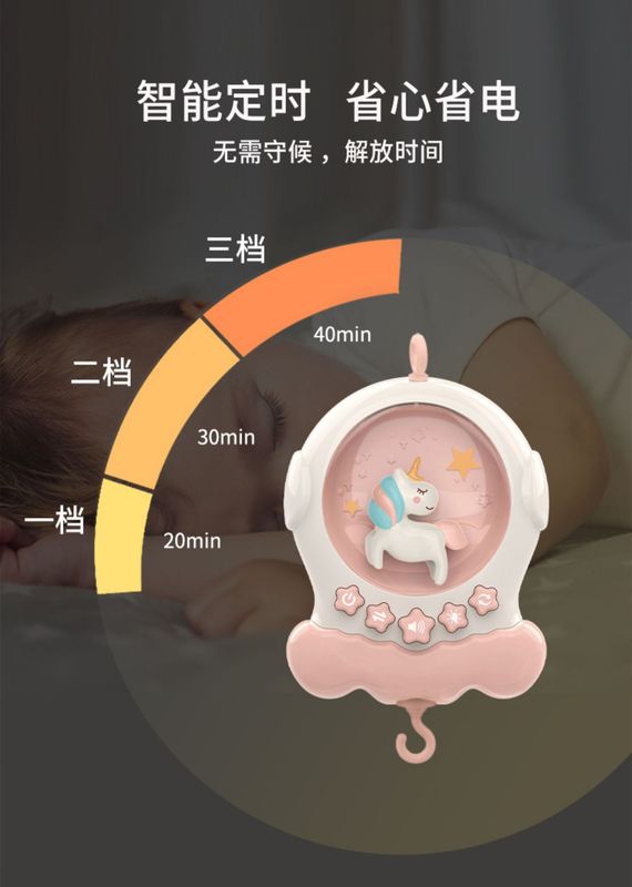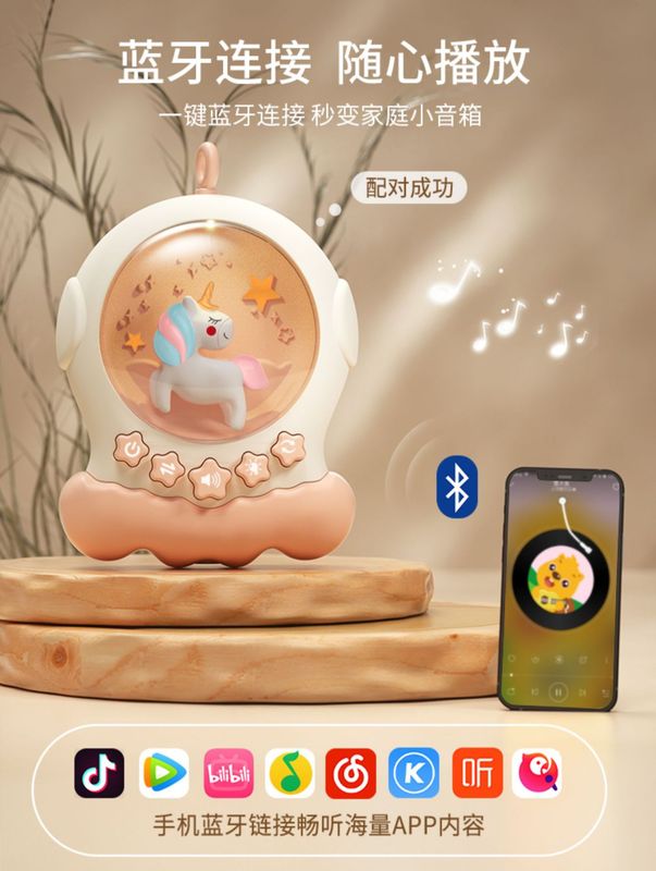 - Featured functions: rotation, anti-squint, warm night light, Bluetooth connection, smart timing, a variety of early education content (music, stories), chewable pendants