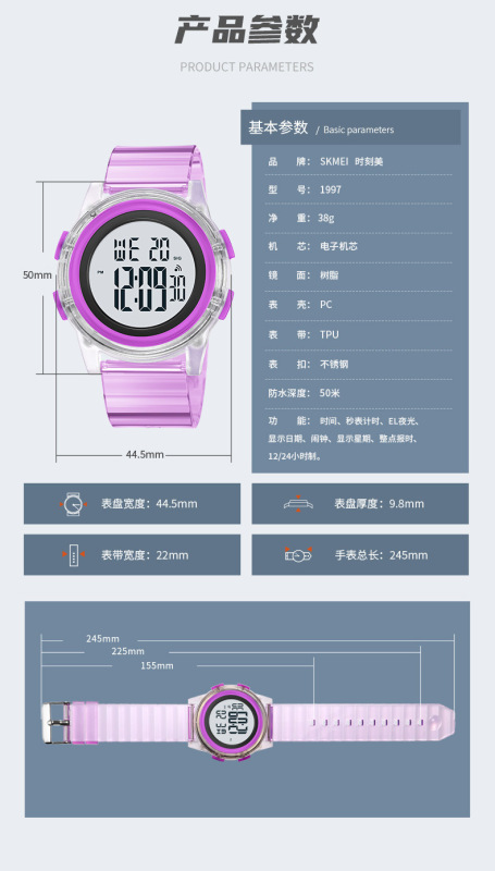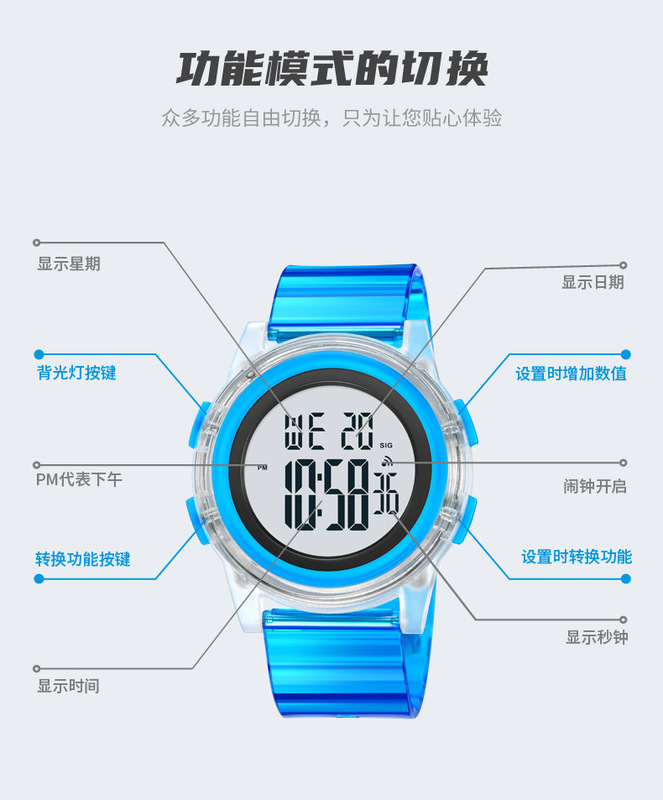 - 特殊功能:時間、秒表計時、EL夜光、顯示日期、鬧鐘、顯示星期、整點報時、12/24小時制。
