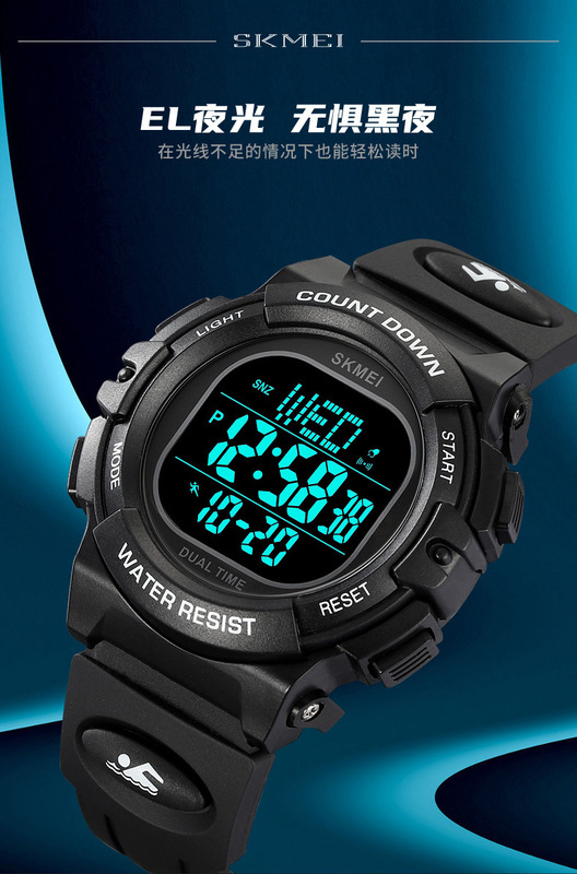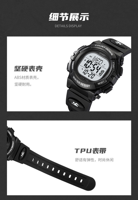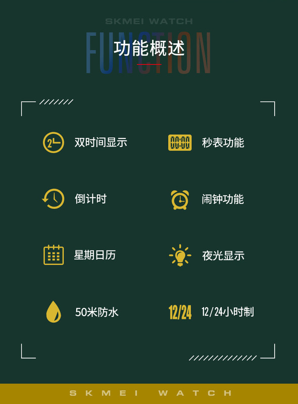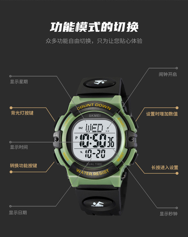 - 特殊功能:兩地時間、秒表計時、EL夜光、顯示日期、鬧鐘、顯示星期、整點報時、12/24小時制、倒計時