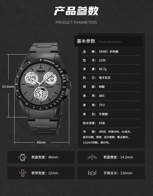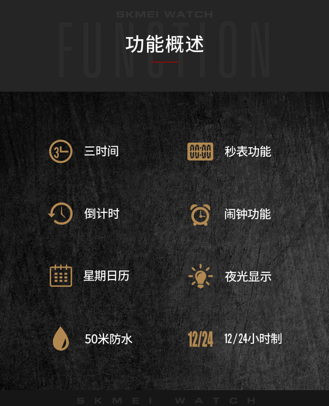 - 特殊功能:3時間、秒表計時、EL夜光、顯示日期、鬧鐘、顯示星期、整點報時、12/24小時制、倒計時