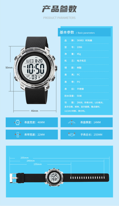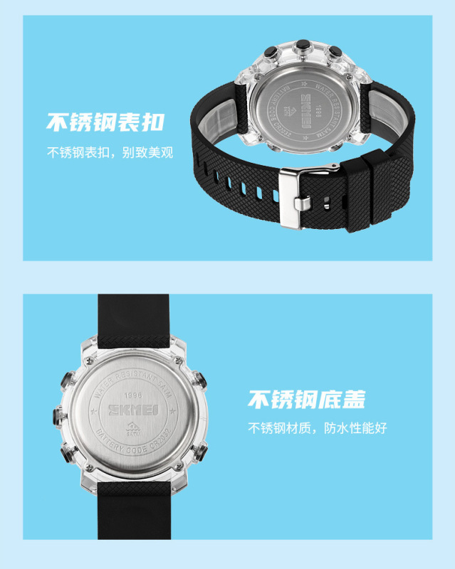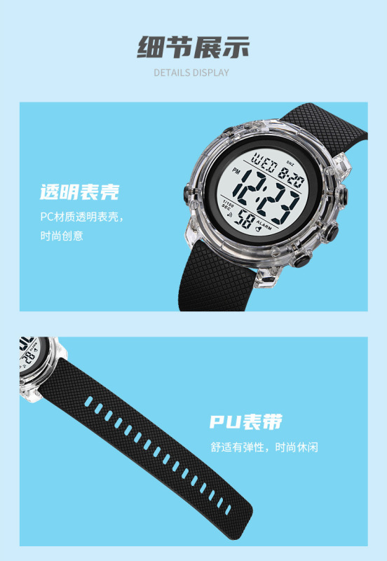 - 特殊功能:兩地時間、秒表計時、EL夜光、顯示日期、鬧鐘、顯示星期、整點報時、12/24小時制、倒計時