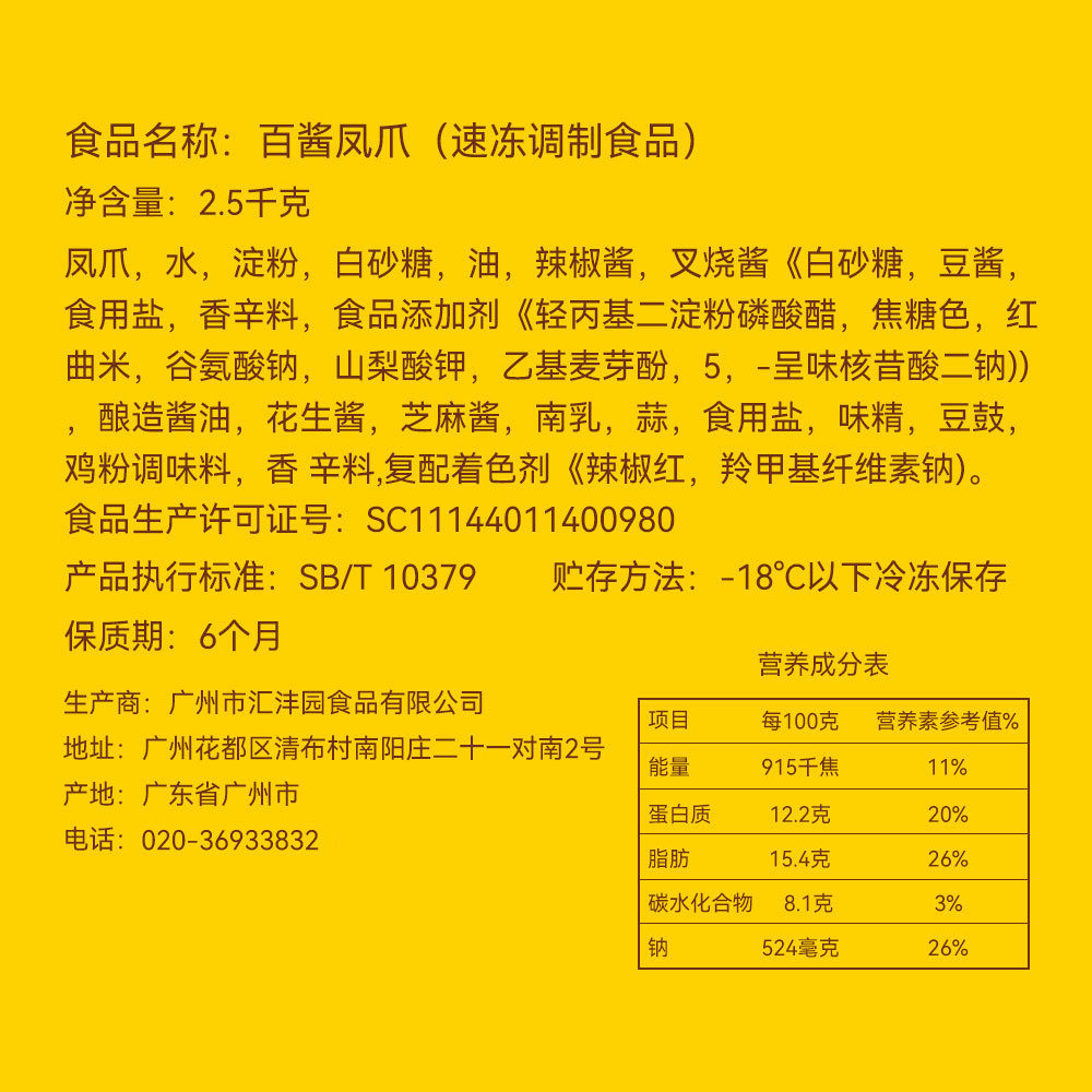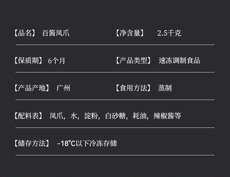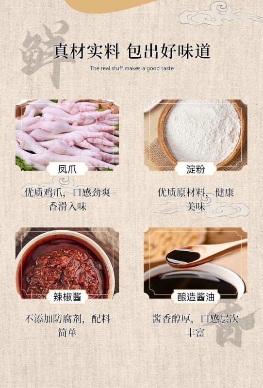 - Raw materials and ingredients: chicken feet starch oyster sauce chili sauce barbecued pork sauce