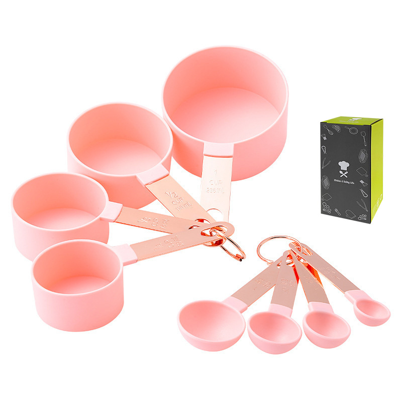 - Specification: Copper-plated handle pink measuring cups and spoons (color box)