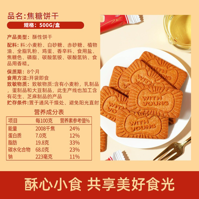 - Packaging specifications: 500g caramel biscuits (about 35 packs)