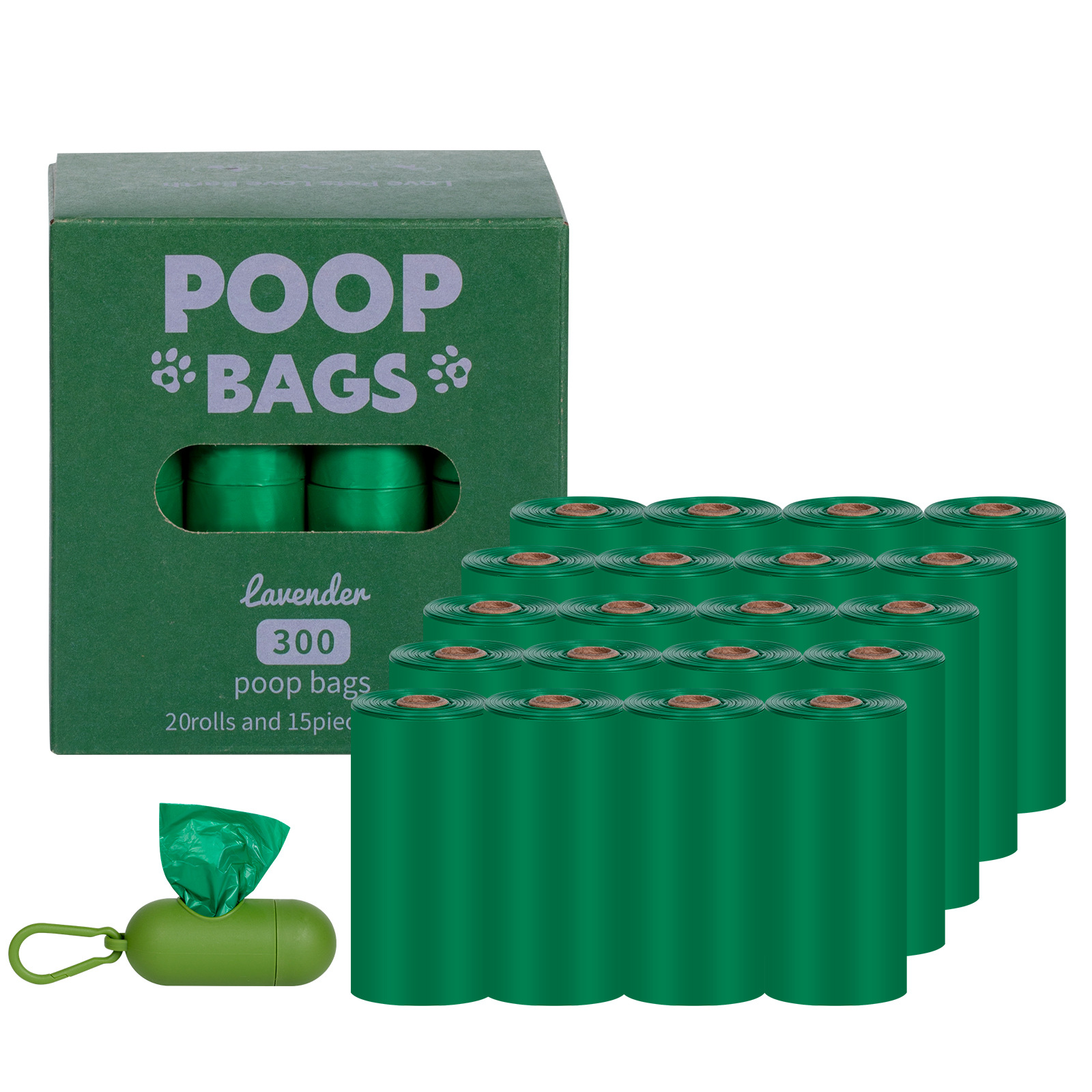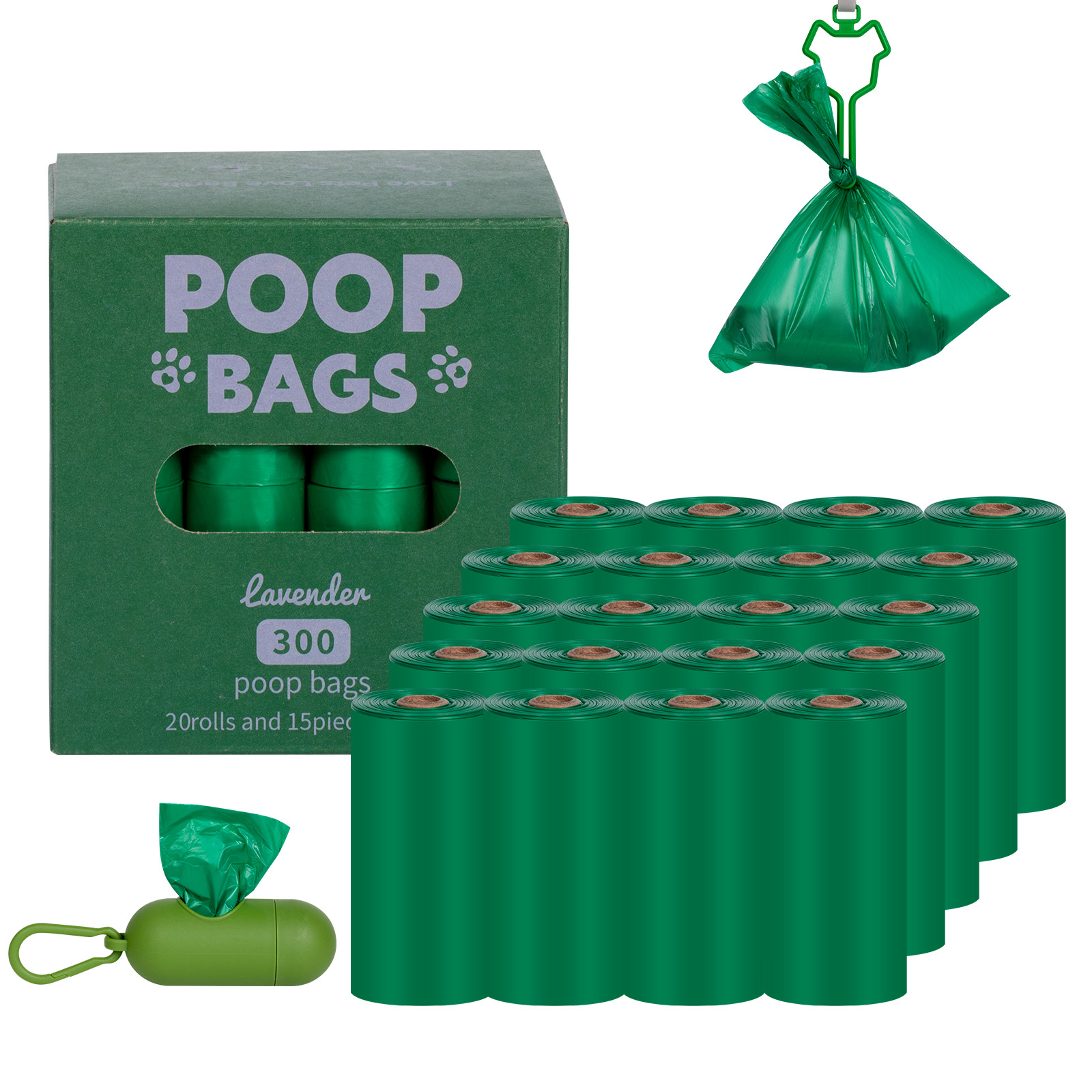 - Specifications: Green 20 rolls + dispenser + clip box