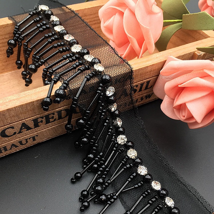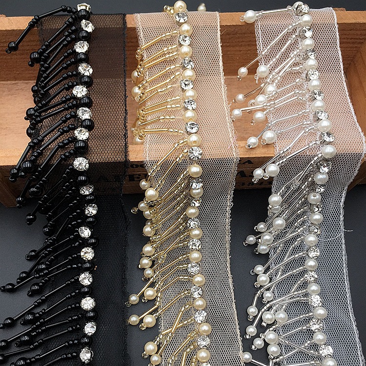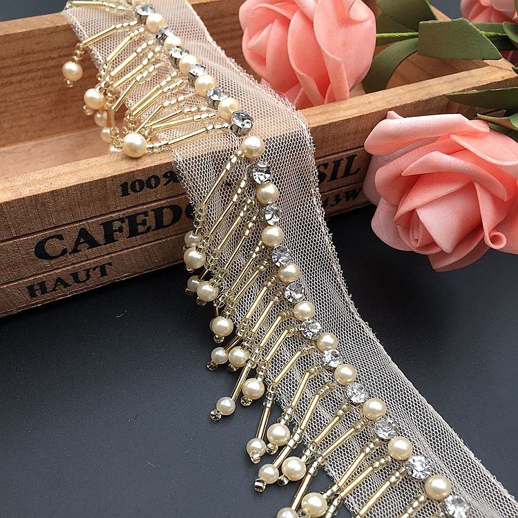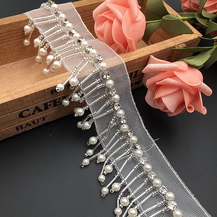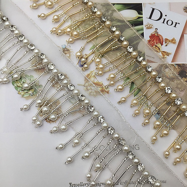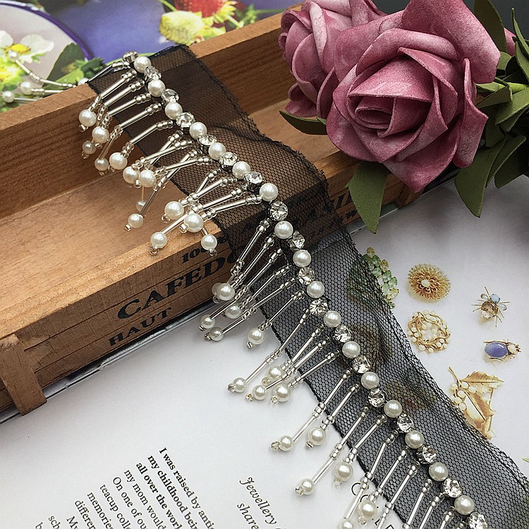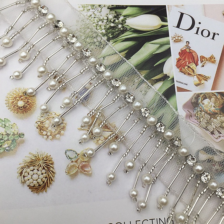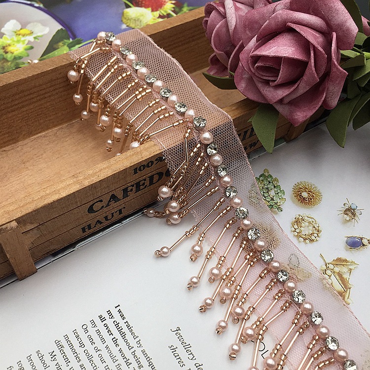 - 材質:底托水鑽網紗底玻璃米珠/珠管珍珠泡珠