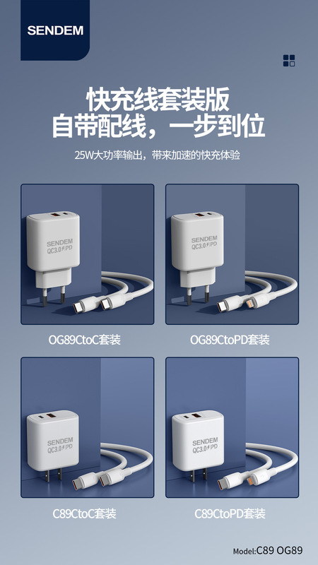 - 適用型號:OG89-PD套裝-優能雙口PD25W+QC3.0歐規充電器