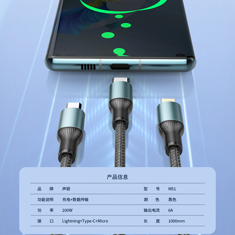 - 型號:M51甄品200W三合一編織快充線(三星/蘋果15專用)
