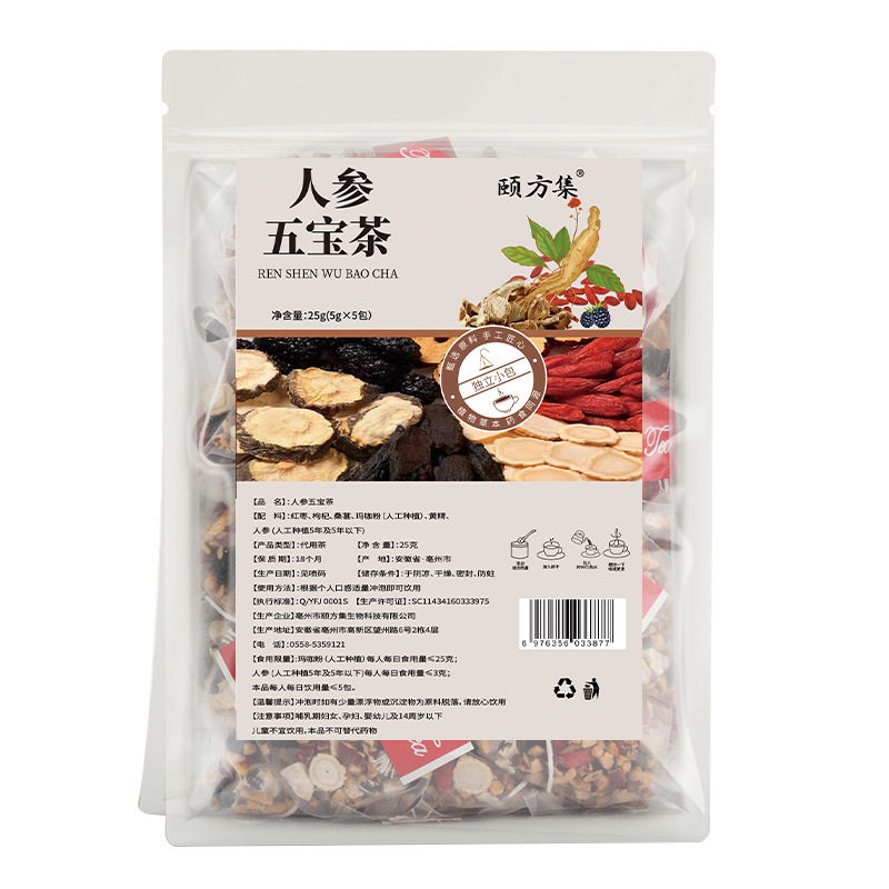 - Packaging specifications: Ginseng Five Treasure Tea (5gx5 bags)/bag