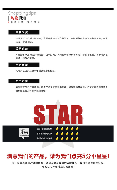 Delivery time: For products in stock, they will be shipped within 3 working days (excluding holidays) after you place your order and make payment. You will receive our notification after shipment.