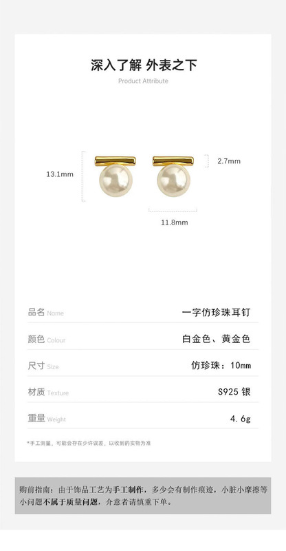 - 純度:925銀(仿珍珠一字耳釘)