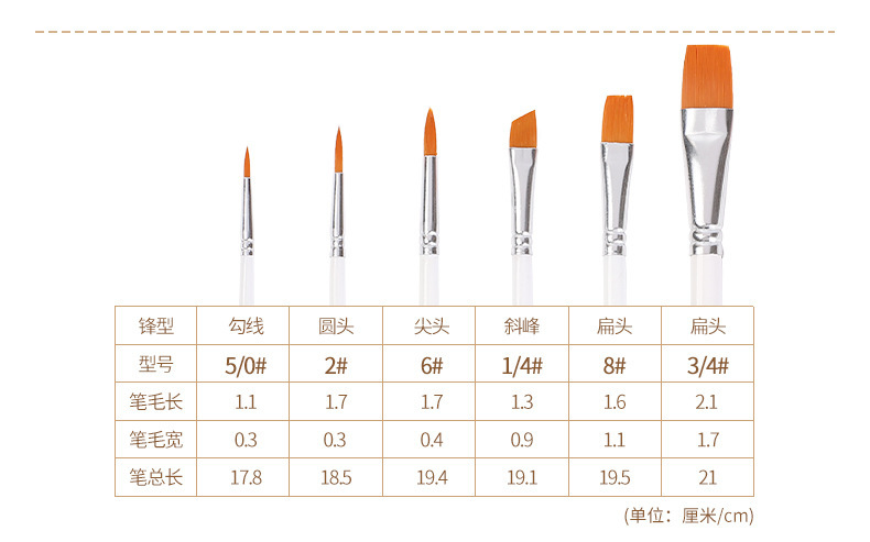- Brush shape: pointed tip, hook line, fan shape, nail round, flat tip, oblique peak