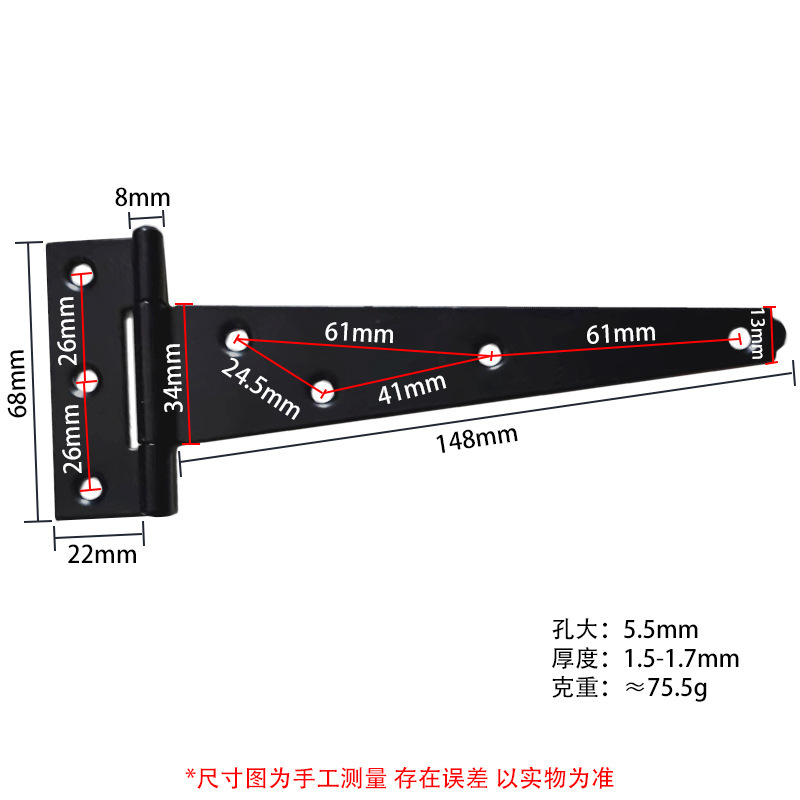 - Specification: T-shaped 6 inches hinge iron with black plating, bulk (not including screws)