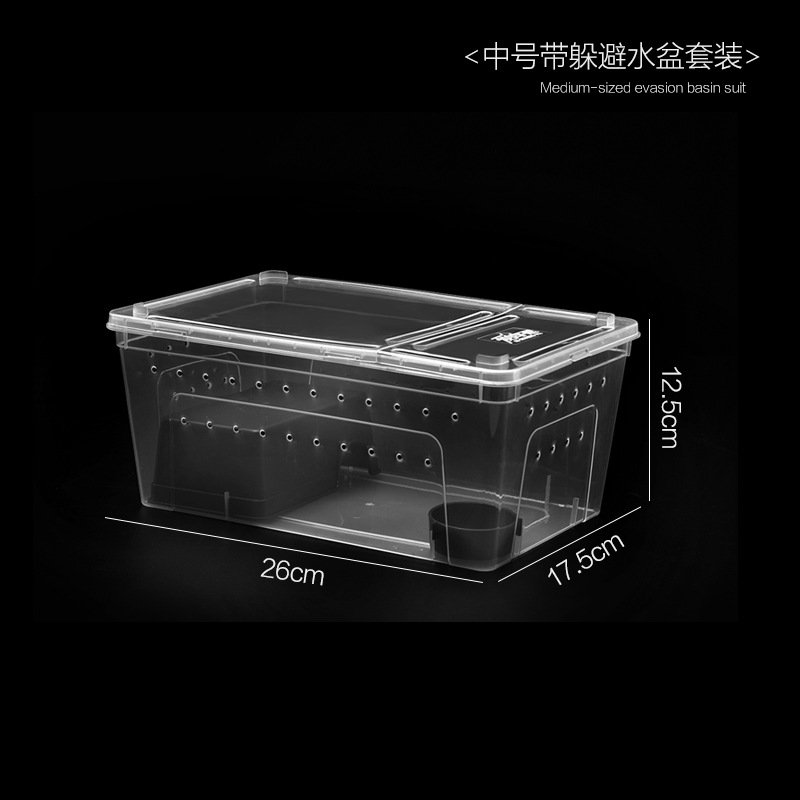 - Specification: Medium-sized High Translucent Black饲养盒 with Water Bowl (26cm L x 18cm W x 15.5cm H)