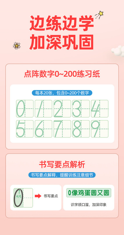 - Specification: Numbers 0-9 (20 pages of repeated practice)