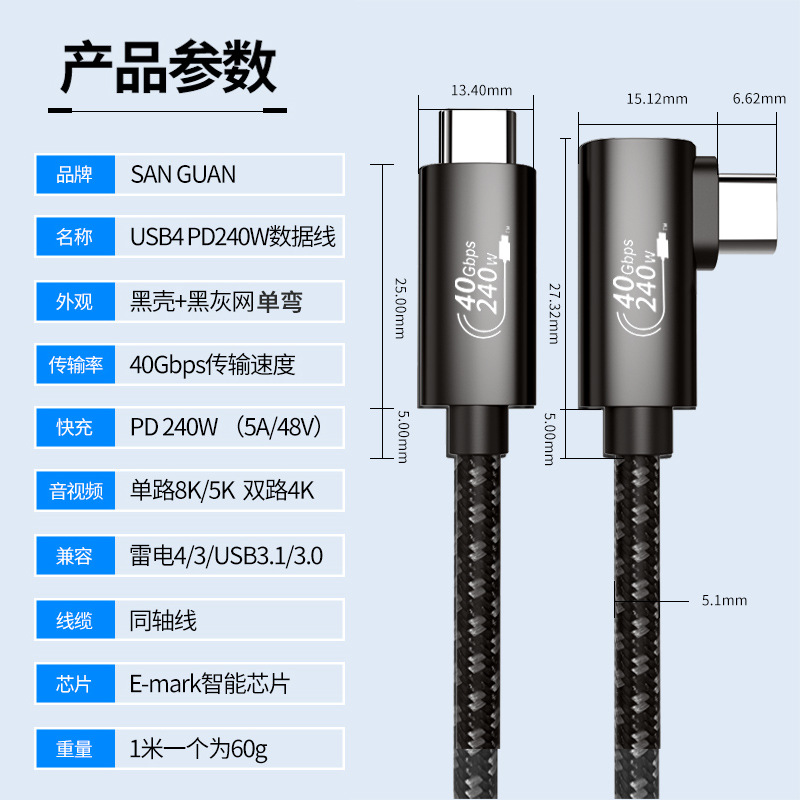 - 型號:1米黑灰網彎頭同軸(40Gbps+8K60Hz+240W)