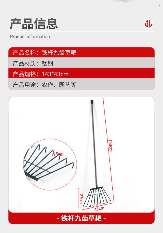 - Specification: Iron Rod Nine-Tooth Grass Rake