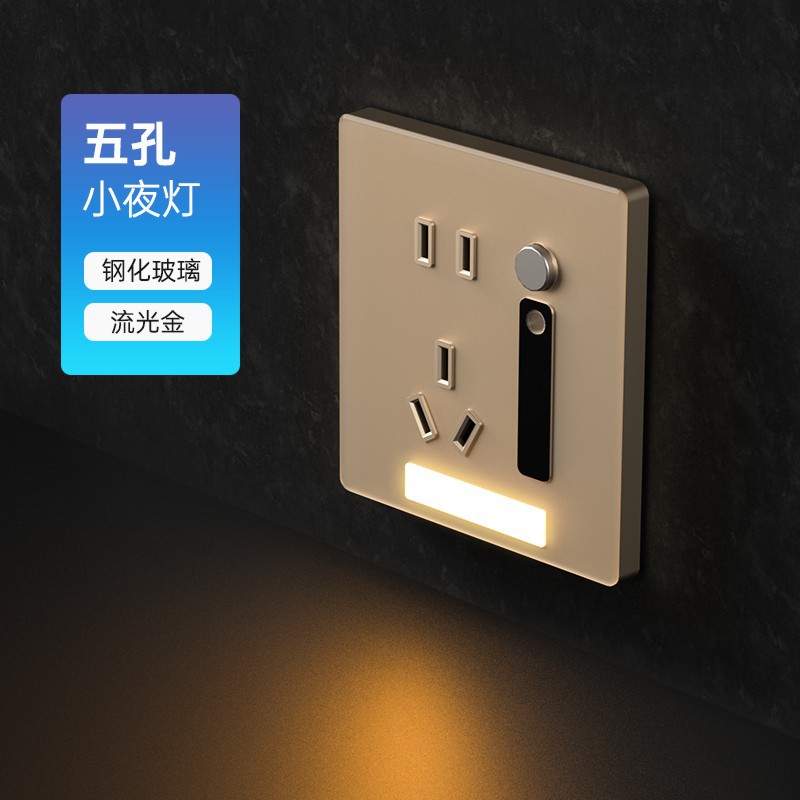 - Model: 5-socket + sensor night light [Gold tempered glass]