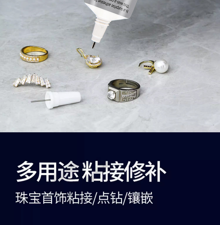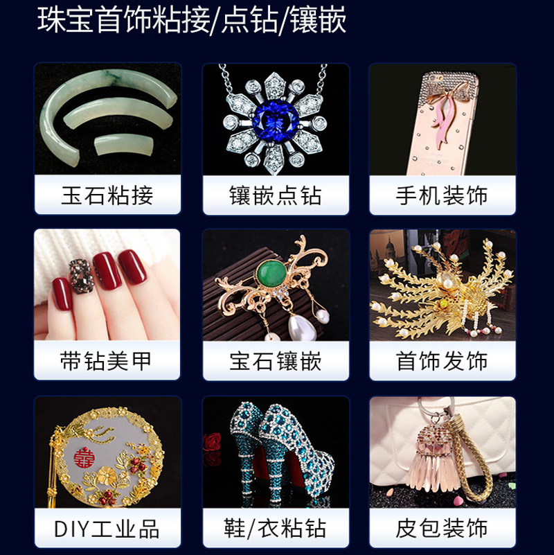 - Application Range: Bonding Ceramic, Plastic, Hardware, Jewelry, Gemstones, Stone Setting