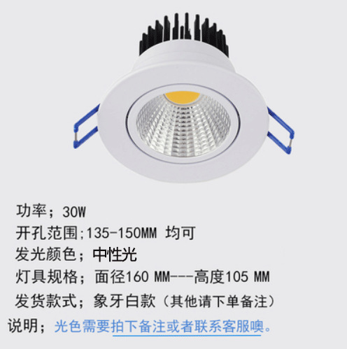 - 功率:30w【開孔13-15CM】中性光