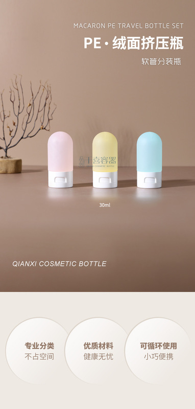 - Specification model: Upside-down velvet surface bottle;本色30ml; PE