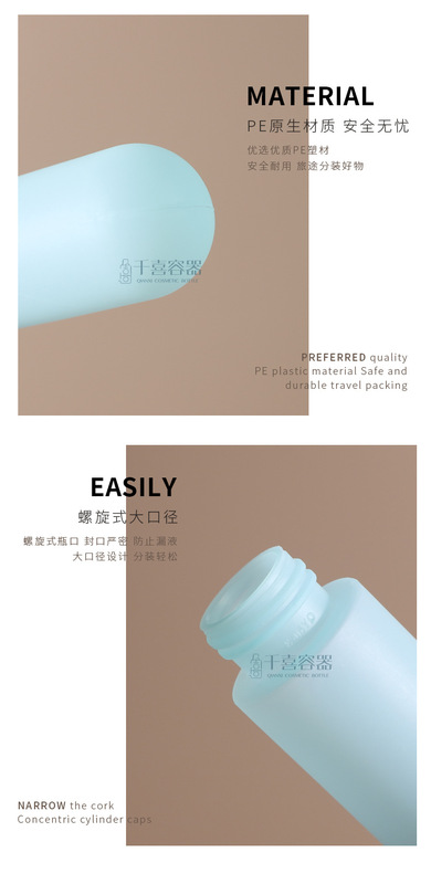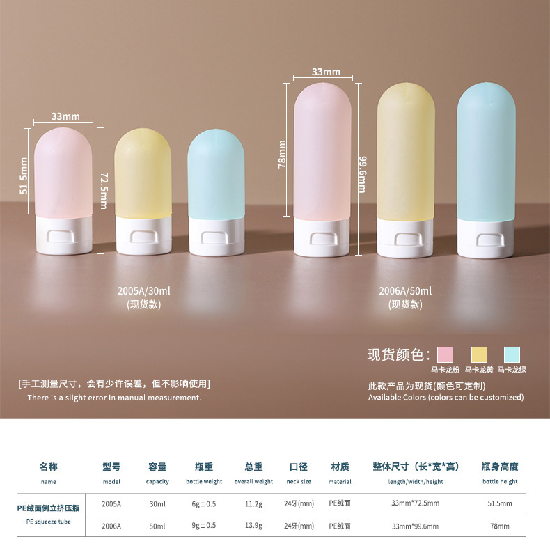 - Specification model: Upside-down velvet surface bottle;本色50ml; PE