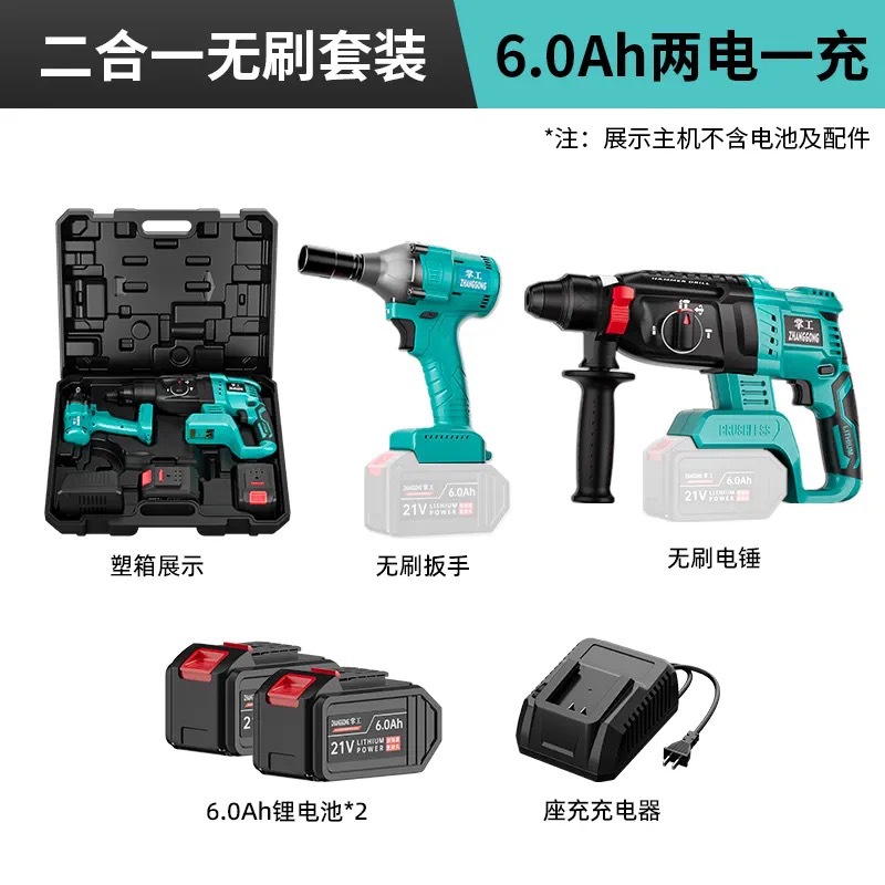 - 型號:電錘6.0Ah兩電一充+角磨機+扳手