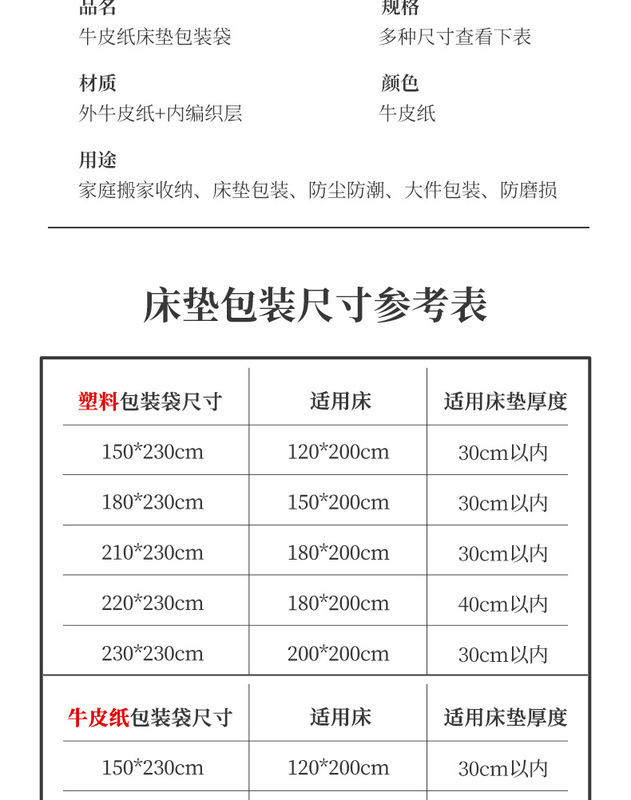 - Model Specifications: Double-Layer牛皮纸 Bag [Suitable for 180*200cm Thick Mattress]