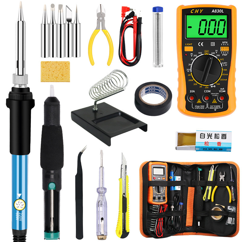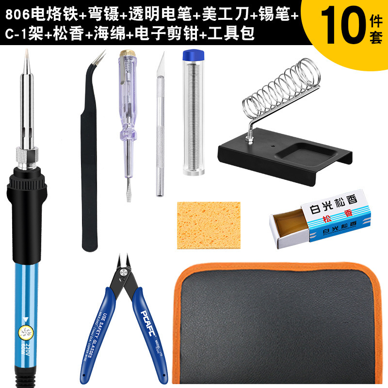 - 型號:806英規烙鐵+防器+萬表+表筆+膠布+電筆+介刀+5個頭+黑彎鑷+松香+綿+鉗+錫筆藍+C1架+包