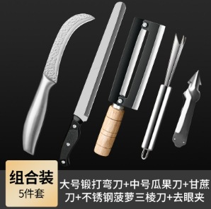 - Specification: Large Forged Curved Knife + Medium Fruit & Vegetable Knife + Sugarcane Knife + Stainless Steel Triangular Pineapple Knife + Eye Remover