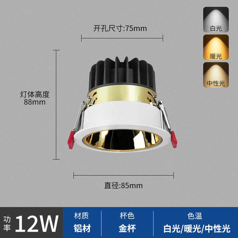 - Power: White Cup 12W, Hole Opening 75mm, Surface 85mm
