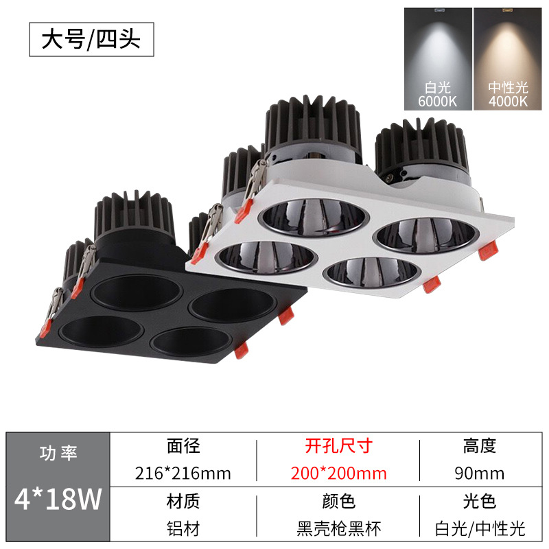 - Power: Quad White Shell 4*18W, Diameter 216*216, Cut-out 200*200mm