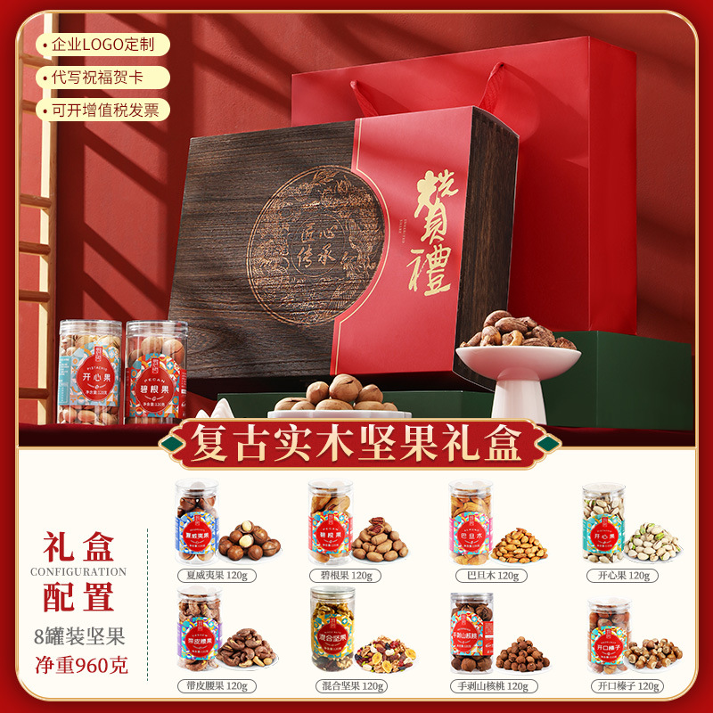- 包裝規格:高檔實木禮盒:B款8罐【6罐堅果+2罐零食】