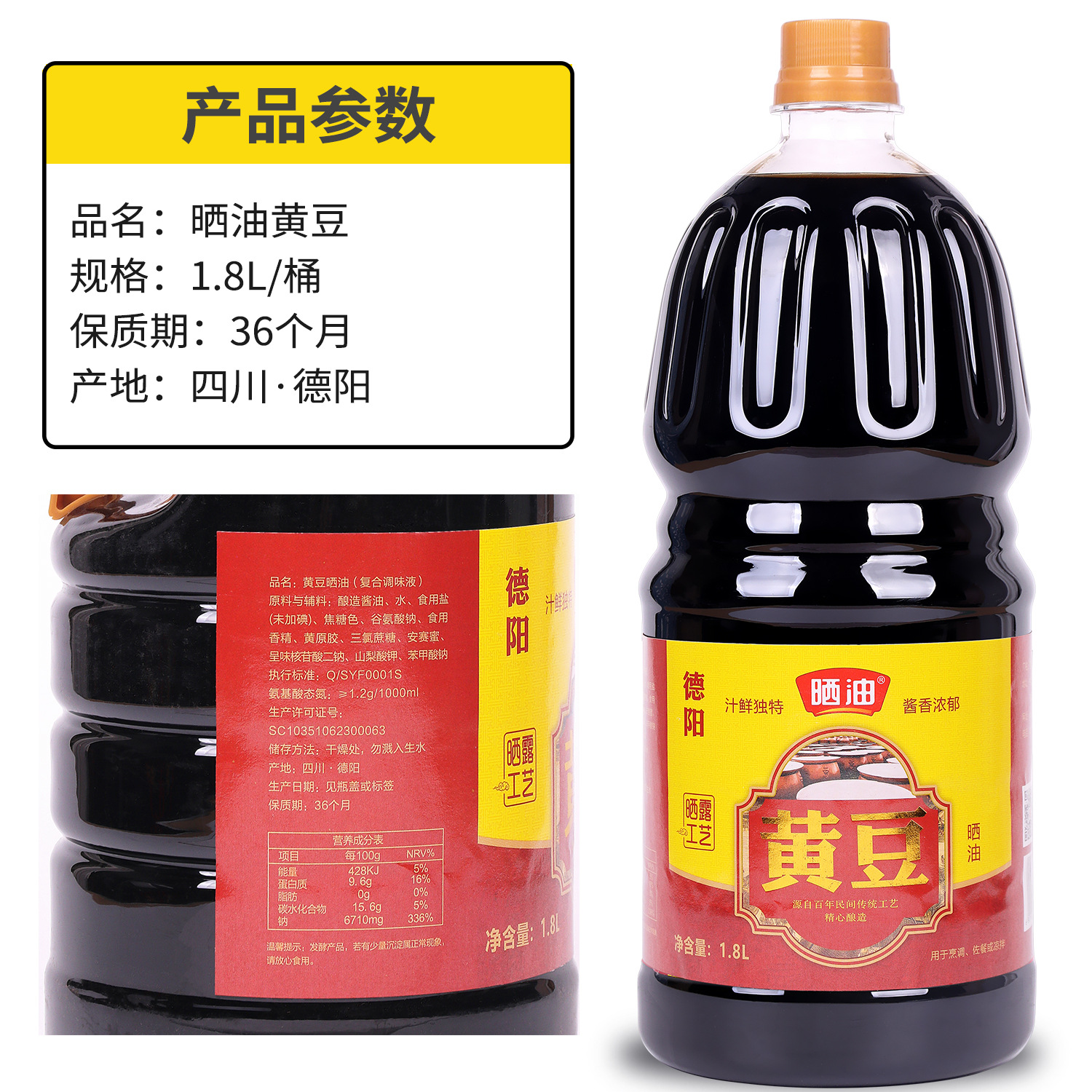 - Packaging Specification: Soybean Sun-dried Soy Sauce 1.8L*1 bottle